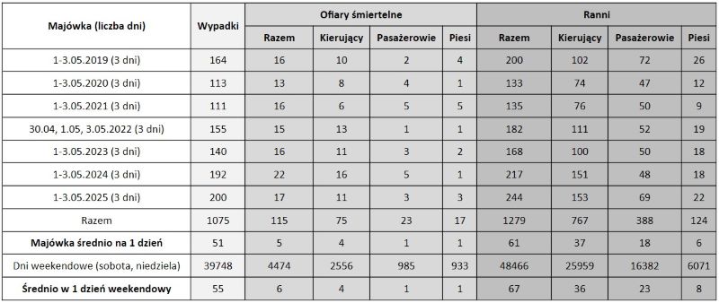 Jak wynika z zestawienia danych, w latach 2019-2025 w dniach 1-3 maja doszło łącznie do 1075 wypadków, w których zginęło 115 osób, a 1279 zostało rannych. Średnio daje to 51 wypadków dziennie, podczas gdy przeciętny dzień weekendowy w tym samym okresie to 55 wypadków.